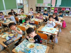 今日の給食は、1年生にとって待ちに待った初めての「ラーメン」でした。 大きな袋に入ったソフト麺に少し苦戦しながらも、箸…