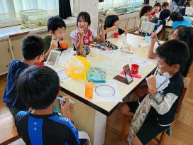 1年生は、夏休みの思い出を思い出して絵にしています。「お母さんと花火を見たよ!」「お祭りのかき氷、おいしかったな。」とに…