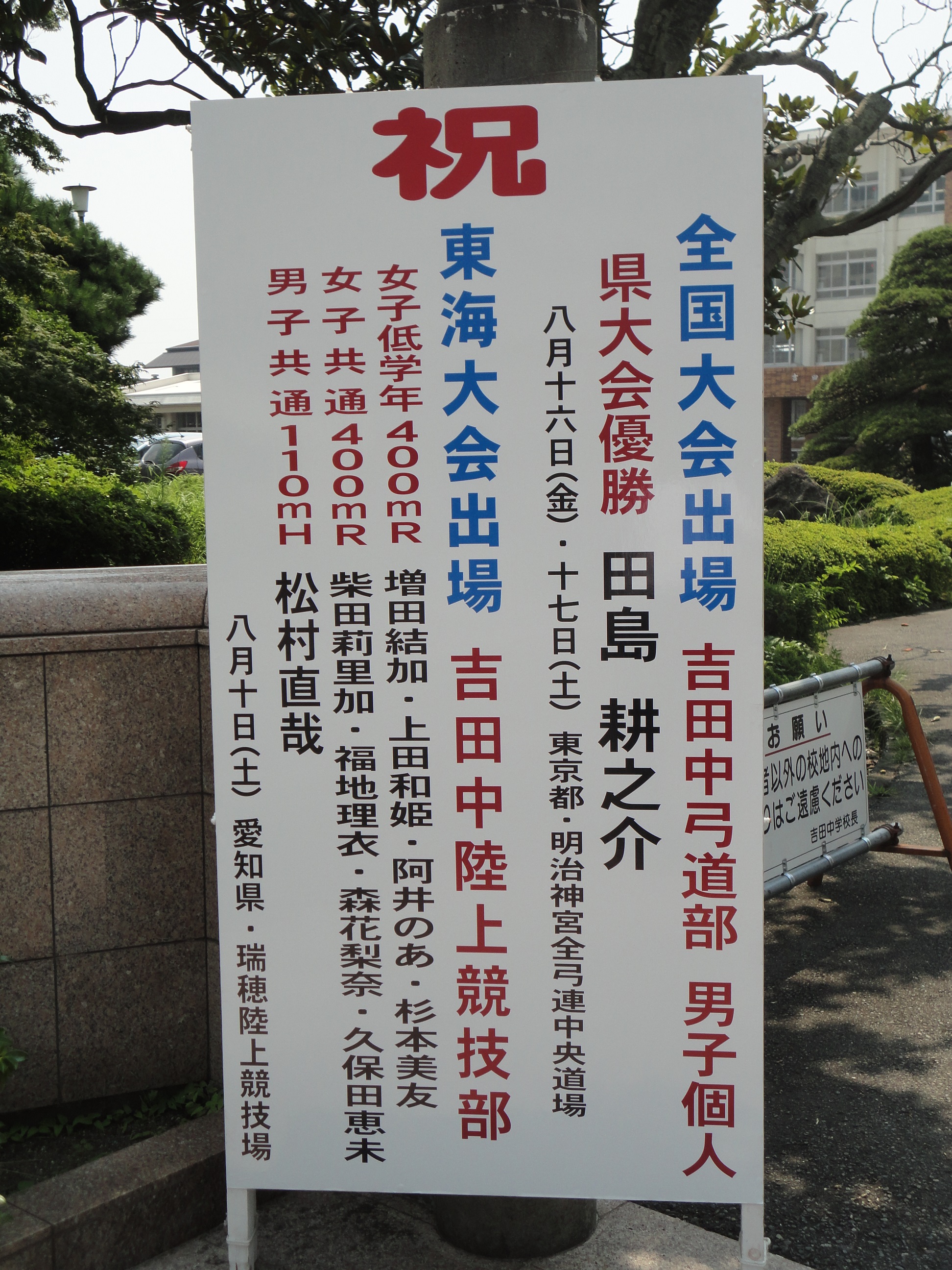 本年度の中体連も県大会を終えて、東海大会に入ってきました。吉田中学校からは、弓道部男子の田島耕之介さんが8/16,17 に東京、明治神宮で行われる全国大会に、陸上部からは、低学年女子400mR(増田結加、上田和姫、阿井のあ、杉本美友)、共通女子400mR(柴田莉里加、福地理衣、森花梨奈、久保田恵未)、男子共通110mHで松村直哉さんが8/10名古屋瑞穂陸上競技場で開催の東海大会に出場します。