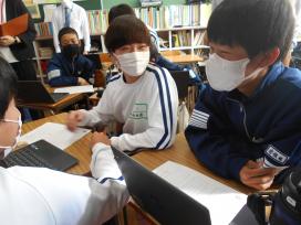 3年8組にて、山岸先生による提案授業が行われ、全職員で参観しました。「戦争を防ぐためにルールを作ろう」を課題に、資料から… |  |